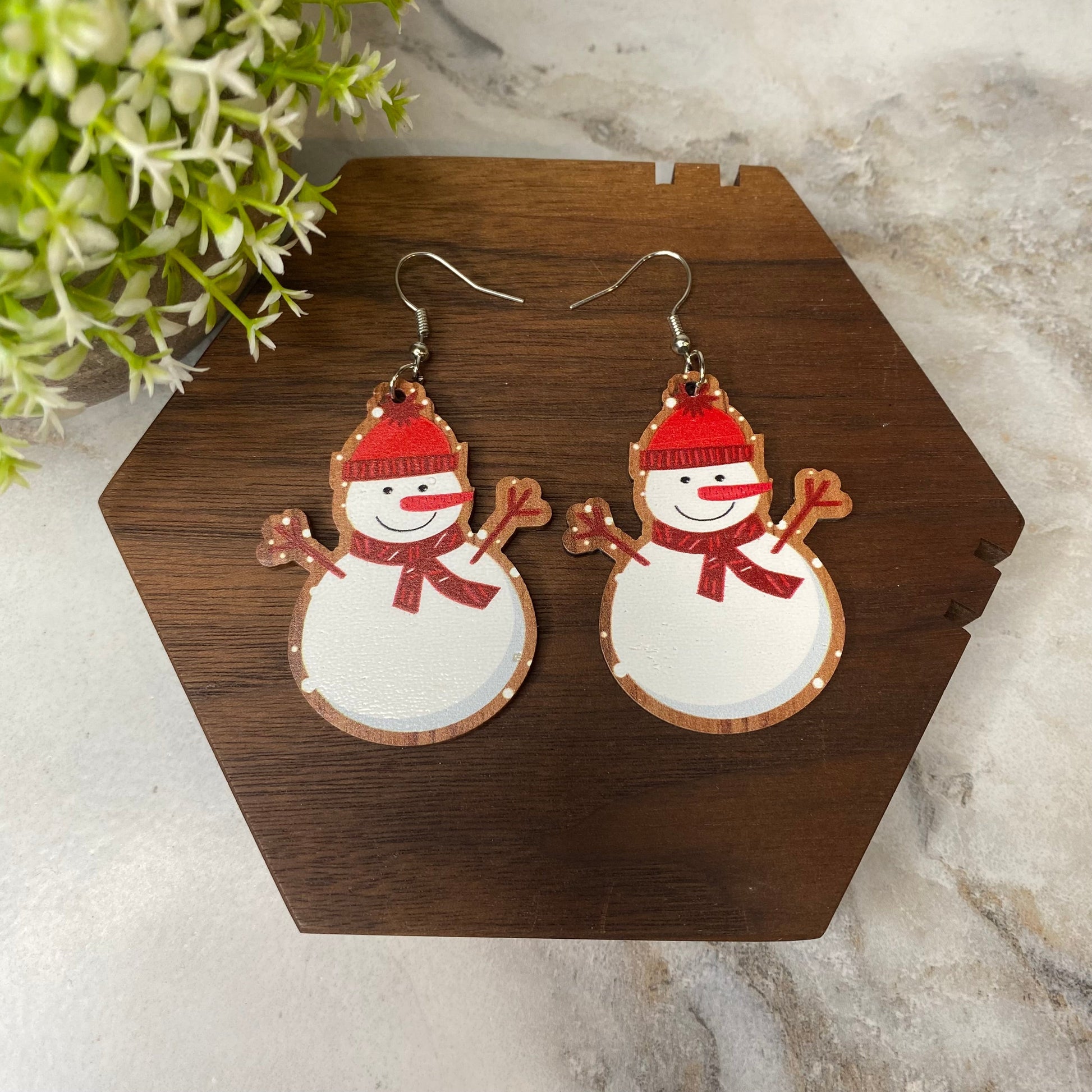 Wooden Dangle Earrings - Christmas - Snowman Hat Scarf