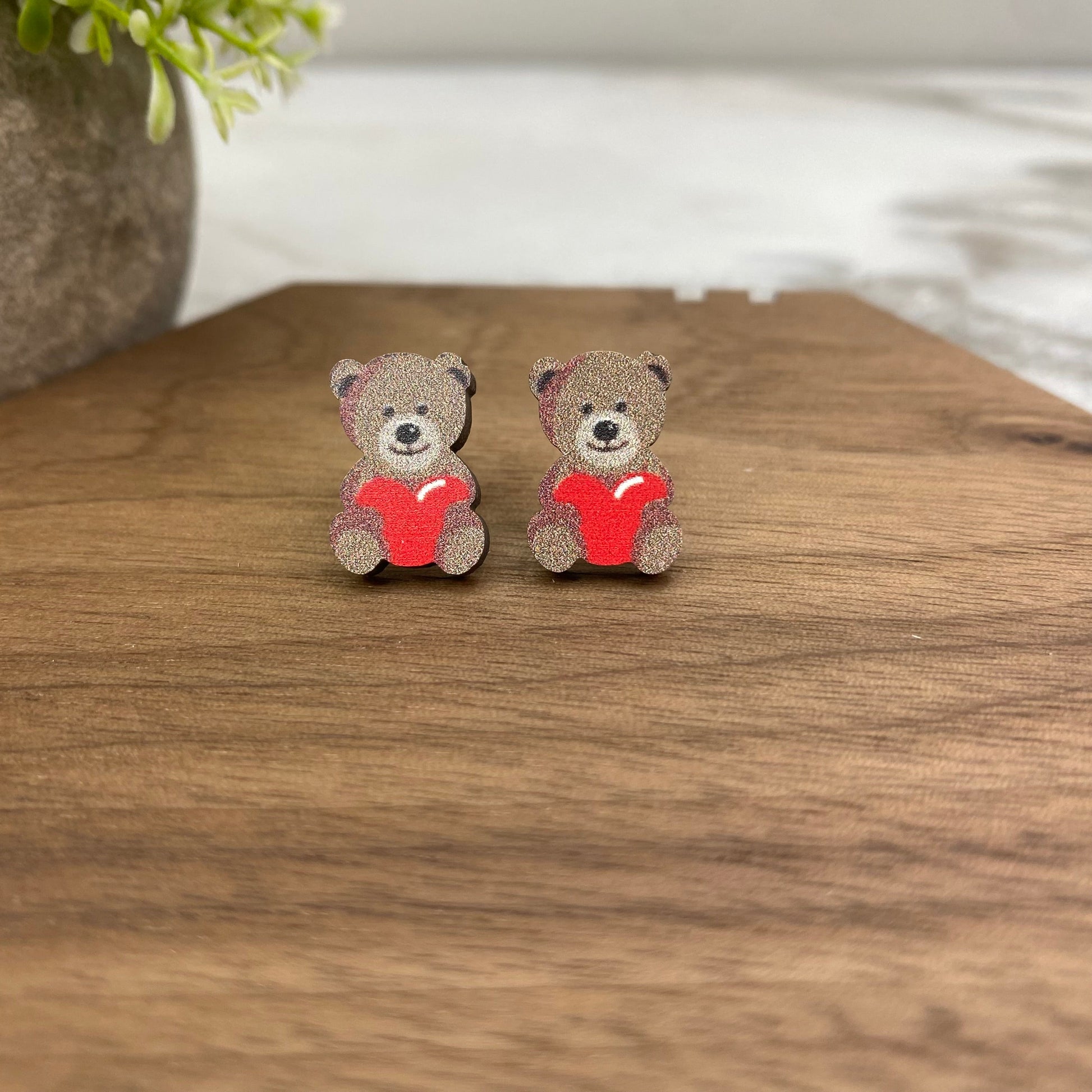 Wooden Stud Earrings - Heart Bear - #12